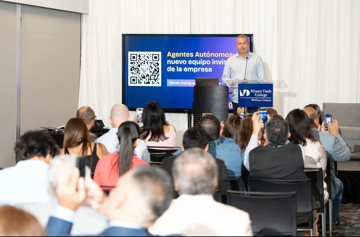 Pedro Santos, Director Ejecutivo de Tecnologías Emergentes - Miami Dade College. El evento se centró en cómo la inteligencia artificial, la automatización y la innovación digital están redefiniendo las maneras de competir y liderar en el entorno global actual.
