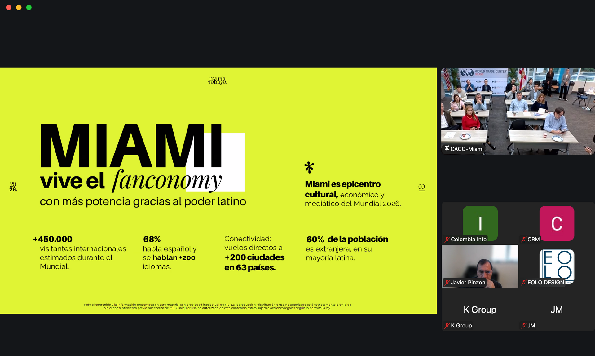El pasado 14 de enero, Colombian American Chamber Of Commerce Miami inauguró su calendario de eventos del año con un encuentro clave para empresarios, líderes y marcas: "¿Cómo Ganar en el Mundial de Fútbol 2026 sin Ser Sponsor Oficial?". El evento se llevó a cabo en un formato híbrido, reuniendo a asistentes presenciales en el World Trade Center y a participantes virtuales a través de Zoom para explorar las vastas oportunidades que ofrece el torneo.