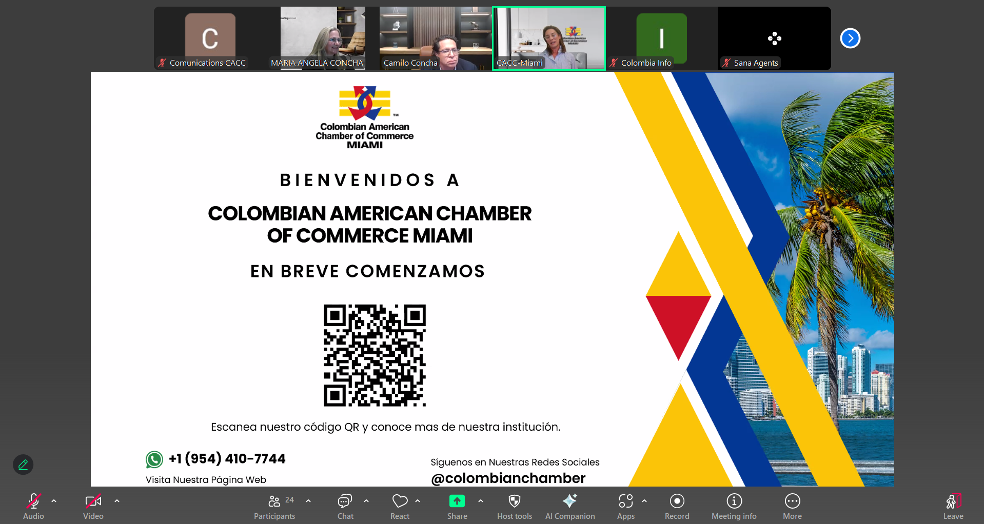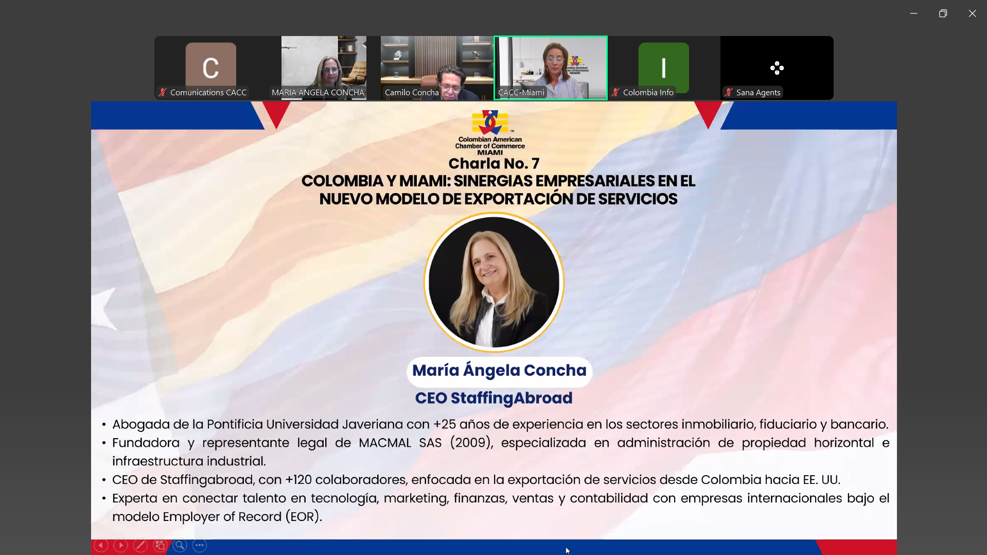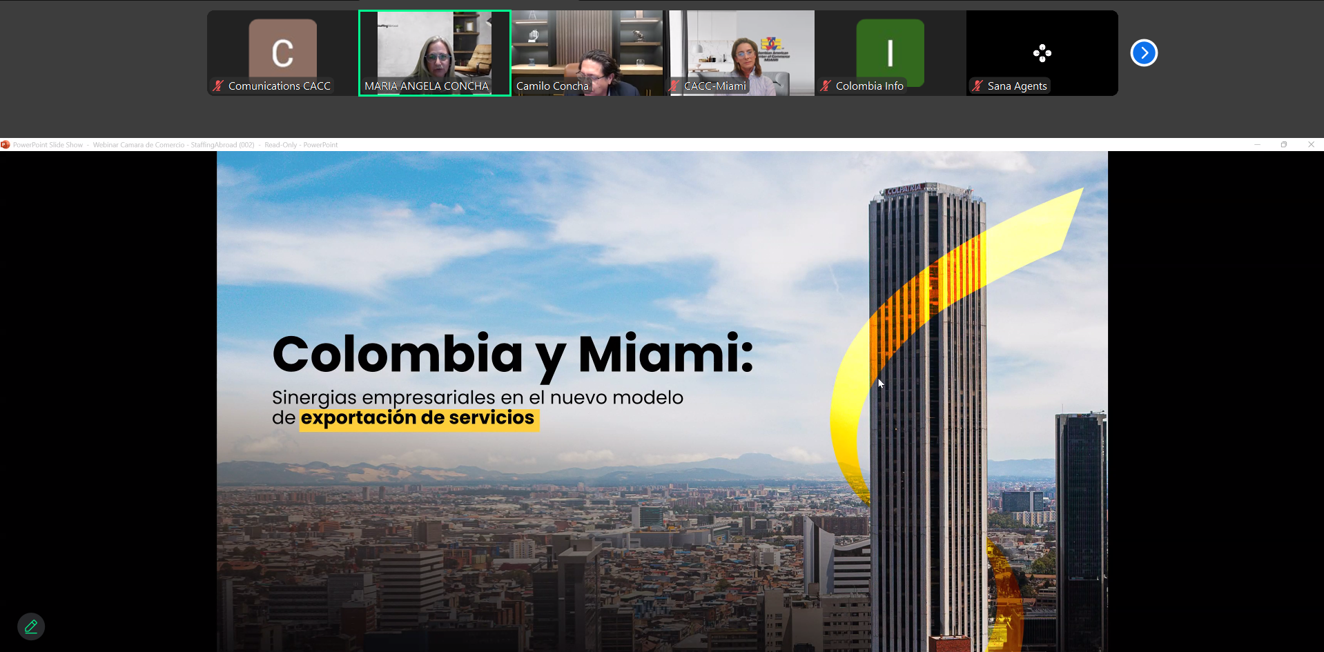 modelo de exportación de servicios y las oportunidades de negocio entre Colombia y Miami. La sesión, realizada vía Zoom, fue un espacio para explorar las sinergias y beneficios de las alianzas empresariales.